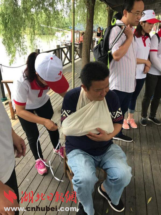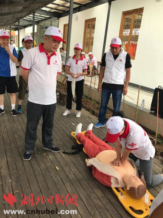 湖北日报网消息(记者 魏亚春 实习生 金玄明)7月9日,蔡甸区红十字会组织30多位志愿者在蔡甸金龙水寨进行“水上遇险”综合救援演练,在武汉国仁应急管理技术公司的支持下,完成水面救援、翻船自救、空中侦察、孤岛救援、紧急医疗、伤员转运及抢通道路等志愿者训练内容。